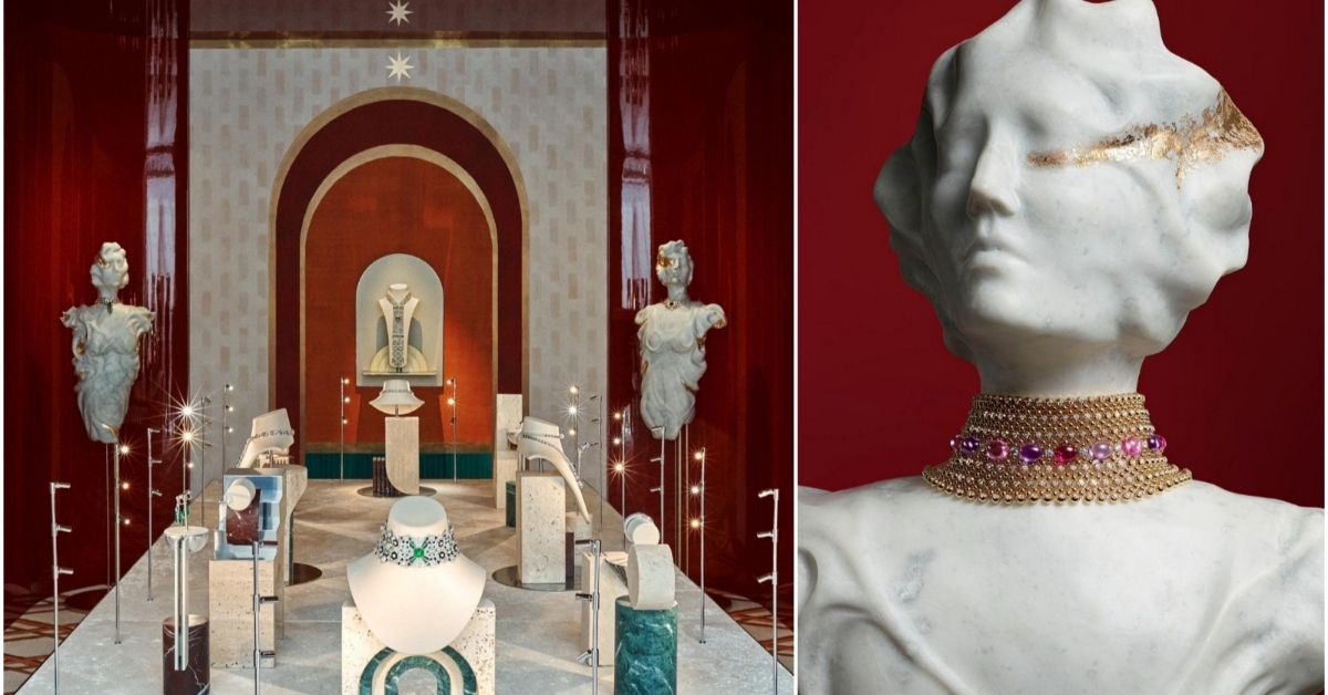威尼斯藝術家Riccardo Gatti創作的6件卡拉拉大理石與金箔雕塑,成為展示高級珠寶的藝術品。